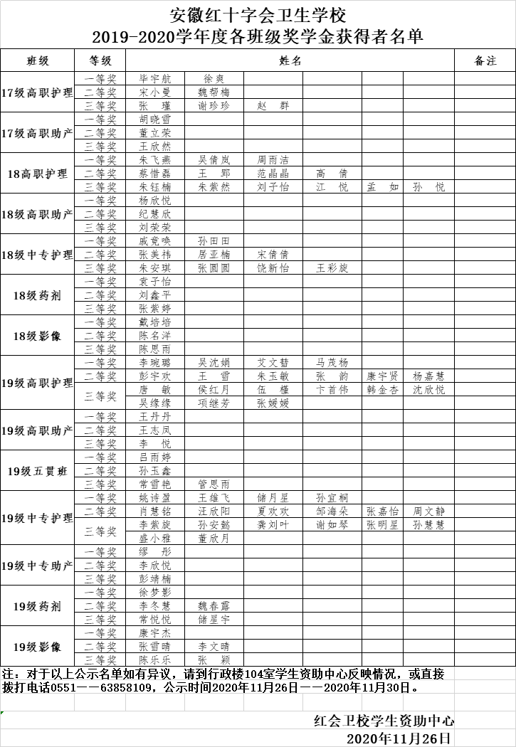 安徽紅十字會衛(wèi)生學(xué)校2019-2020學(xué)年度各班級獎(jiǎng)學(xué)金獲得者名單