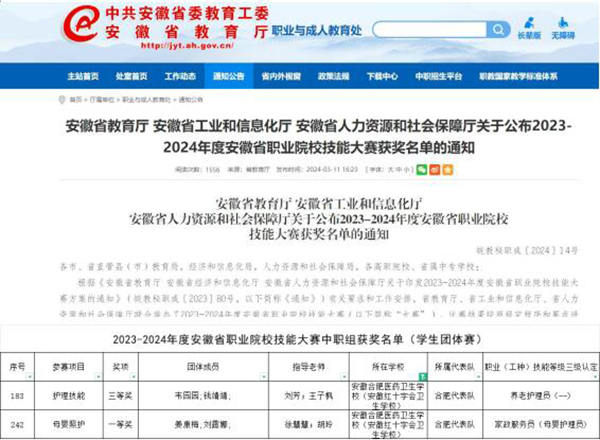 ? ? ? ?3月11日,安徽省教育廳在官網(wǎng)發(fā)布《安徽省教育廳 安徽省工業(yè)和信息化廳 安徽省人力資源和社會(huì)保障廳關(guān)于公布2023-2024年度安徽省職業(yè)院校技能大賽獲獎(jiǎng)名單的通知》,根據(jù)文件精神,安徽合肥醫(yī)藥衛(wèi)生學(xué)校姜康梅、劉露娜,韋園園、錢(qián)靖靖四名同學(xué)分別在母嬰護(hù)理、護(hù)理技能學(xué)生團(tuán)體賽項(xiàng)中榮獲一等獎(jiǎng)、三等獎(jiǎng)。同時(shí)根據(jù)有關(guān)文件精神,參賽的兩組四名學(xué)生分別被省人社部門(mén)認(rèn)定具備相應(yīng)的專業(yè)技能等級(jí)。