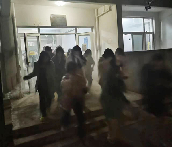 ? ? ? ?晚上九時(shí)許,一陣一陣的緊急哨聲、彌漫的煙霧分別在學(xué)生一號(hào)宿舍樓響起、環(huán)繞?!爸鹄玻鹄病?,同學(xué)們大聲的呼喊著,“同學(xué)們,不要慌張,捂好口鼻,彎腰低頭,迅速有序撤離”,樓梯的引導(dǎo)老師在緊急疏散學(xué)生。在老師的指揮下,全體同學(xué)按照預(yù)定疏散路線(xiàn)迅速撤離宿舍樓,到達(dá)指定位置集合。