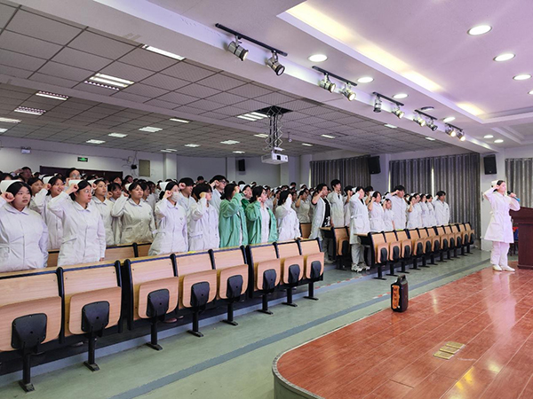 ? ? ? ?崗前教育大會中,實習(xí)就業(yè)處副主任梁益民著重強調(diào)實習(xí)管理的相關(guān)事宜,對學(xué)生在實習(xí)期間紀(jì)律、安全、請假等事項提出具體要求,要求實習(xí)生在實習(xí)期間,嚴(yán)格遵守實習(xí)點操作規(guī)范,認(rèn)真聽取帶教老師的指導(dǎo),同時叮囑同學(xué)們要做好科室安全防護,并表達(dá)對實習(xí)生美好祝福。教師代表楊舒娟老師對同學(xué)們進(jìn)行崗前培訓(xùn)指導(dǎo)。楊老師結(jié)合自身多年帶教經(jīng)驗,與同學(xué)們分享了自己的成長經(jīng)歷和學(xué)習(xí)方法。最后,實習(xí)生代表牛妤晗、梁思帆進(jìn)行發(fā)言,她們在發(fā)言中表達(dá)了嚴(yán)格遵守學(xué)校、醫(yī)院各項管理規(guī)定,認(rèn)真完成各項實習(xí)任務(wù),努力提升自己專業(yè)技能,并帶領(lǐng)實習(xí)學(xué)生進(jìn)行莊嚴(yán)宣誓。
