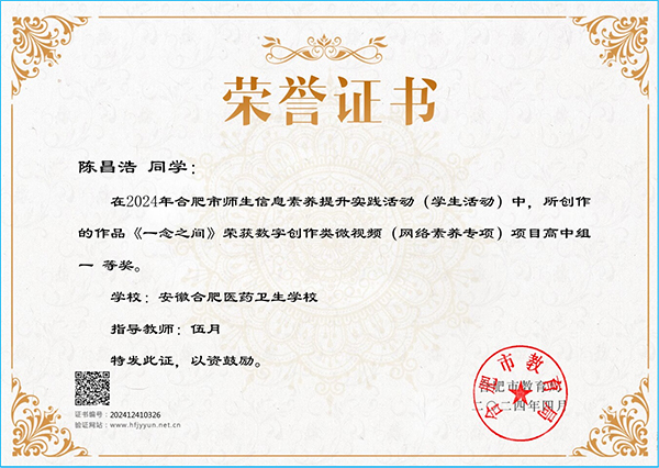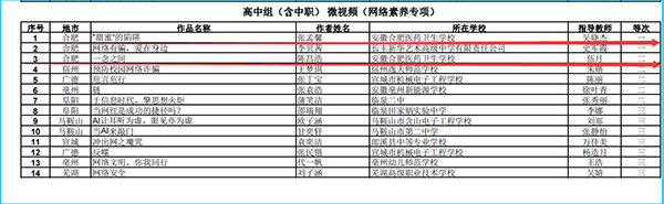 ? ? ? ?2024年,安徽醫(yī)藥衛(wèi)校推選9件作品參加合肥市師生信息素養(yǎng)活動(dòng)評(píng)比,榮獲3個(gè)一等獎(jiǎng)、2個(gè)二等獎(jiǎng)、3個(gè)三等獎(jiǎng)。在安徽省師生信息素養(yǎng)活動(dòng)評(píng)比中,榮獲1個(gè)一等獎(jiǎng)和1個(gè)二等獎(jiǎng)。