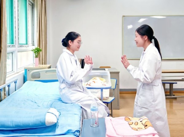 模擬病房中,母嬰照護(hù)賽項(xiàng)的隊(duì)員分別扮演指導(dǎo)護(hù)士與嬰兒,真實(shí)模擬家庭照護(hù)場景。她們一邊以規(guī)范輕柔的動作演示嬰幼兒安全刷牙,一邊用清晰易懂的語言向“家長”講解要點(diǎn),將科學(xué)照護(hù)與人文關(guān)懷完美交融,展現(xiàn)出未來母嬰護(hù)理人員必備的綜合素養(yǎng)。