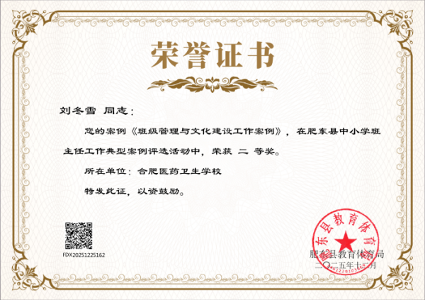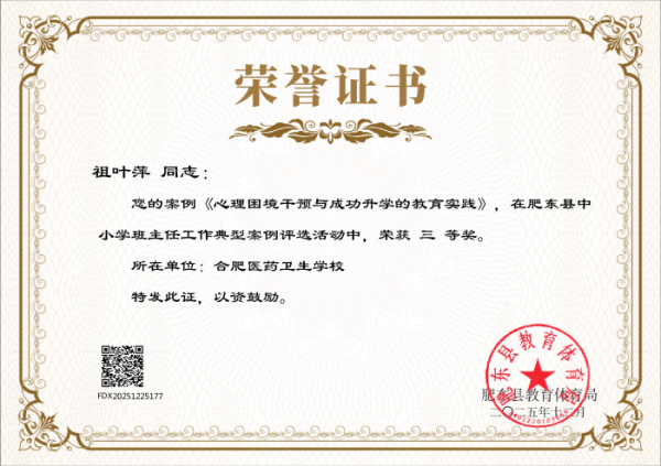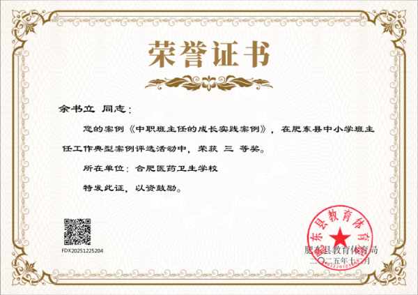 近日,肥東縣教育體育局發(fā)布《關于公布肥東縣中小學班主任工作典型案例評選結果的通知》,安徽合肥醫(yī)藥衛(wèi)生學校多名班主任憑借扎實的育人實踐、創(chuàng)新的管理方法和深刻的教育思考,在此次評選中脫穎而出,喜獲多項榮譽,充分展現(xiàn)了學校班主任隊伍過硬的專業(yè)素養(yǎng)和良好的育人風貌,為學校贏得了榮譽。