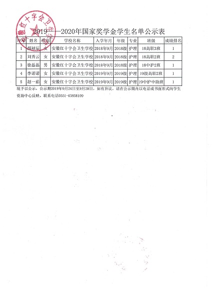 安徽紅十字會衛(wèi)生學(xué)校2019-2020年度國家獎學(xué)金公示