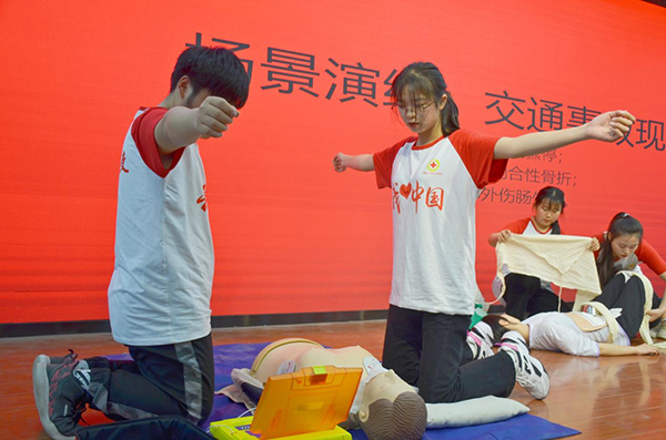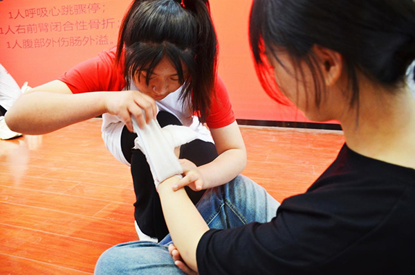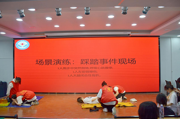 ?????? 熊永玲首先向各位同學(xué)表達(dá)了節(jié)日的祝福,隨后她結(jié)合紅十字常識、護(hù)士的神圣職責(zé)與使命向參加活動的學(xué)生介紹了應(yīng)急救護(hù)的重大意義。隨后演練了地震災(zāi)害現(xiàn)場、踩踏事件現(xiàn)場、交通事故現(xiàn)場三個場景下的應(yīng)急演練活動,每個場景下均模擬三組不同受傷情況,切實通過情景模擬最大程度還原應(yīng)急救護(hù)實地現(xiàn)場,讓學(xué)生知道特殊情況下的傷員救護(hù)該如何處置。隨后,熊永玲對同學(xué)們的三組演練進(jìn)行點(diǎn)評,并指出不足之處。