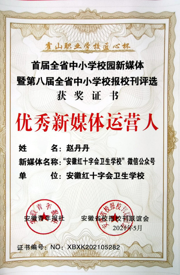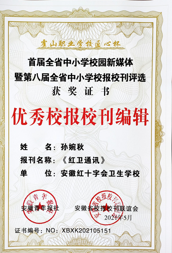 ? ? ? ?近期,由安徽青年報(bào)社、安徽省校報(bào)???lián)誼會(huì)共同主辦的全省首屆中小學(xué)校園新媒體暨第八屆全省中小學(xué)校報(bào)??u(píng)選頒獎(jiǎng)會(huì)在霍山職業(yè)學(xué)校舉行,經(jīng)過(guò)初評(píng)和終評(píng)兩輪評(píng)審,紅會(huì)衛(wèi)校校園文化建設(shè)成果顯著,斬獲多項(xiàng)榮譽(yù),“安徽紅十字會(huì)衛(wèi)生學(xué)?!蔽⑿殴娞?hào)被評(píng)為“首屆全省中小學(xué)十佳校園新媒體”、“首屆全省中小學(xué)優(yōu)秀校園新媒體”,??都t衛(wèi)通訊》被評(píng)為“第八屆全省中小學(xué)優(yōu)秀校刊”,洪梅校長(zhǎng)、趙丹丹老師、孫婉秋老師分別榮獲“優(yōu)秀校長(zhǎng)支持獎(jiǎng)”、“優(yōu)秀新媒體運(yùn)營(yíng)人”、“優(yōu)秀校報(bào)校刊編輯”榮譽(yù)稱號(hào)。據(jù)悉,本次全省共有230余所中小學(xué)申報(bào)申報(bào)五大類評(píng)選。