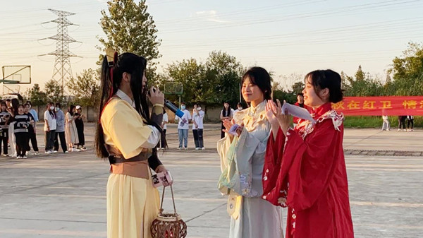 ? ? ? ?“圓圓的十五,圓圓的夢(mèng)。圓圓的月兒掛夜空”,中秋節(jié)是我國(guó)傳統(tǒng)的節(jié)日,它代表了團(tuán)圓、吉祥,為了讓紅衛(wèi)學(xué)子了解更多關(guān)于中秋節(jié)的由來及風(fēng)俗習(xí)慣,體驗(yàn)節(jié)日的氛圍,學(xué)校以中國(guó)傳統(tǒng)佳節(jié)為契機(jī),以活動(dòng)形式為輔,進(jìn)一步弘揚(yáng)和傳播優(yōu)秀傳統(tǒng)文化,并融入漢服、傳統(tǒng)舞蹈、傳統(tǒng)樂器等漢風(fēng)美學(xué),9月20日傍晚,在學(xué)?;@球場(chǎng),在校師生通過漢服走秀、漢服舞蹈表演、吟對(duì)與中秋有關(guān)的詩句、吟唱“帶月”歌曲、古箏演奏等活動(dòng)共同慶祝中秋佳節(jié)。披羅衣之璀璨兮,珥瑤碧之華琚,活動(dòng)中的學(xué)生都沉醉于漢服的璀璨華美,身著漢服,留下傳統(tǒng)與歷史相遇的美好時(shí)刻。