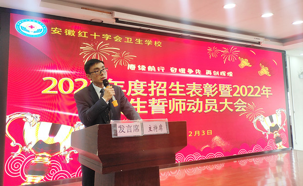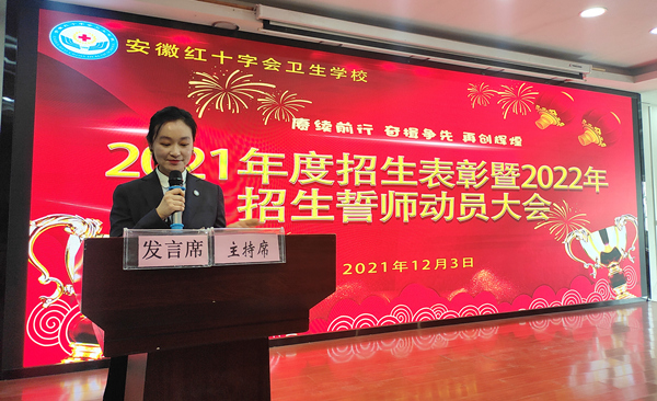 ? ? ? ?伴隨著冬日的那一縷縷陽光,讓整個紅會衛(wèi)校的校園在陽光的照耀下顯得各位的溫暖與愜意。帶著這份冬日的專屬溫馨,12月3日中午,在做好各項(xiàng)防疫工作的前提下,紅會衛(wèi)校在教學(xué)樓一樓多功能廳隆重舉行2022年招生動員大會暨2021年度招生表彰工作大會,校黨總支書記方勁松、校長洪梅、副校長胡軍健出席大會,全體教職工參加大會,會議由招生辦公室負(fù)責(zé)人司蓉主持。