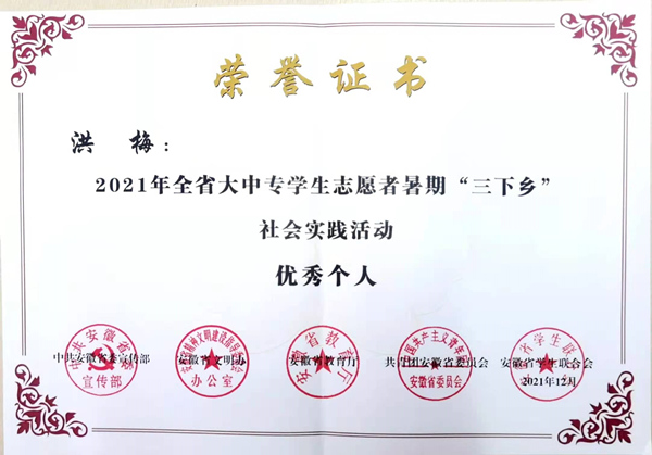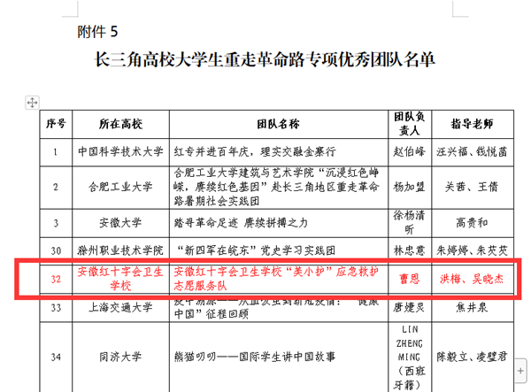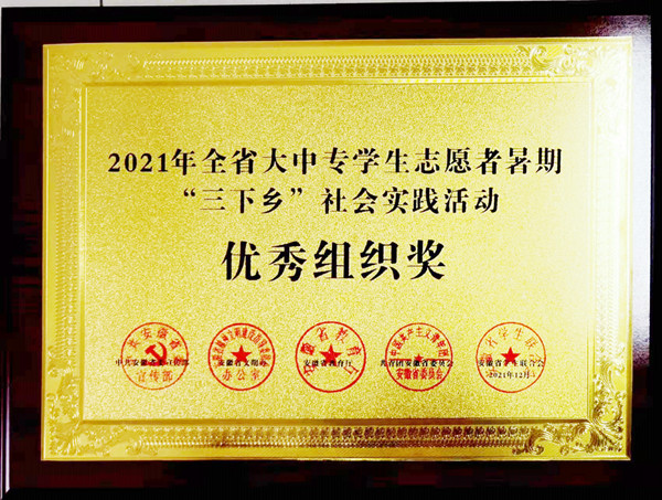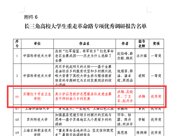 ? ? ? ?近日,團(tuán)省委公布2021年安徽省大中專(zhuān)學(xué)生志愿者暑期文化科技衛(wèi)生“三下鄉(xiāng)”社會(huì)實(shí)踐活動(dòng)評(píng)選結(jié)果,我校是獲獎(jiǎng)院校中唯一一所中專(zhuān)學(xué)校,我校“應(yīng)急救護(hù)志愿服務(wù)隊(duì)”憑借優(yōu)秀的社會(huì)實(shí)踐成果喜獲多項(xiàng)省級(jí)表彰。學(xué)校獲得安徽省“三下鄉(xiāng)”社會(huì)實(shí)踐活動(dòng)優(yōu)秀組織單位,學(xué)?!懊佬∽o(hù)”應(yīng)急救護(hù)志愿服務(wù)隊(duì)獲得長(zhǎng)三角高校大學(xué)生重走革命路專(zhuān)項(xiàng)優(yōu)秀團(tuán)隊(duì),校長(zhǎng)洪梅榮獲安徽省社會(huì)實(shí)踐活動(dòng)優(yōu)秀個(gè)人,由洪梅、吳曉杰、丁衛(wèi)東、趙丹丹幾位老師撰寫(xiě)的調(diào)研報(bào)告獲得長(zhǎng)三角高校大學(xué)生重走革命路專(zhuān)項(xiàng)優(yōu)秀調(diào)研報(bào)告。